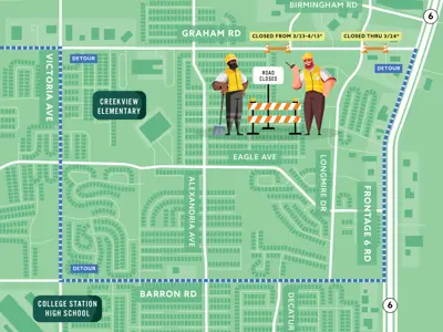 Starting Monday at 9 a.m., Graham Road will be closed between Birmingham Road and Dove Crossing Lane for about three weeks while the City’s contractor replaces a concrete storm sewer. Detours will be in place. Graham will also be closed east of Longmire Drive on Monday while crews complete utility work. That section of Graham will reopen Monday evening.